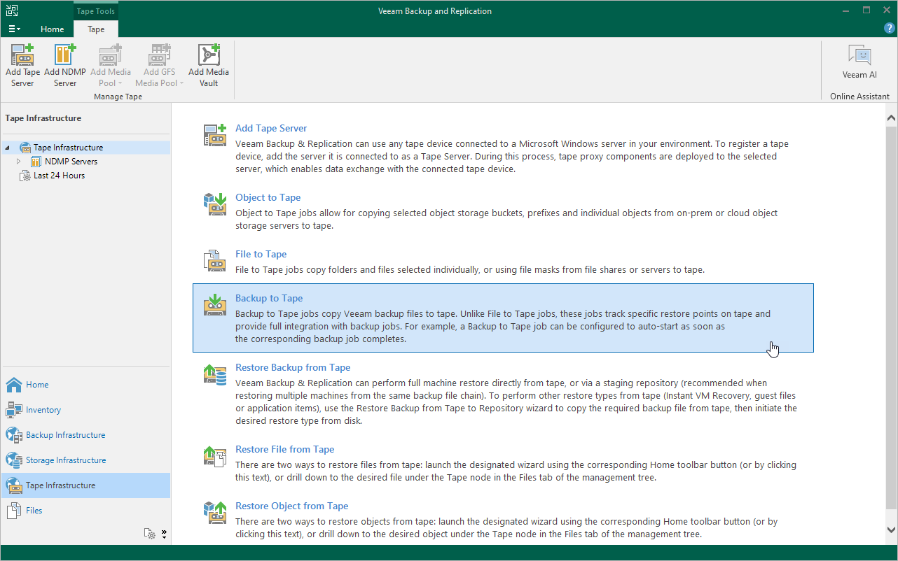 - Create a backup to tape job as described in the Veeam Backup & Replication User Guide, section Creating Backup to Tape Jobs.