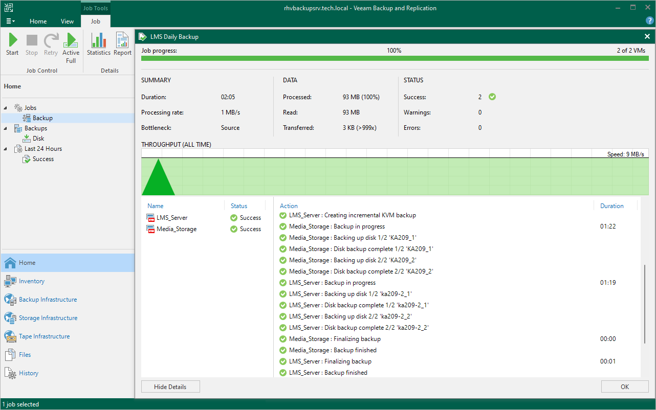 To see the bottleneck statistics for a specific VM, click Show Details, select the VM name in the Name column and check the Load record in the Action column. To learn how to analyze the statistics, see Veeam Backup & Replication User Guide, section Performance Bottlenecks.