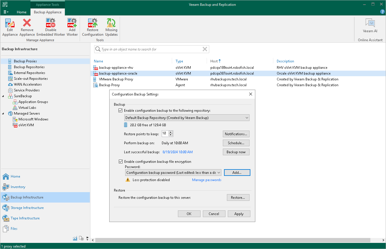 While performing configuration backup, Veeam Backup for OLVM and RHV exports data from the configuration database and saves it to a backup file in a backup repository. To back up the configuration database of the backup appliance manually, do the following: