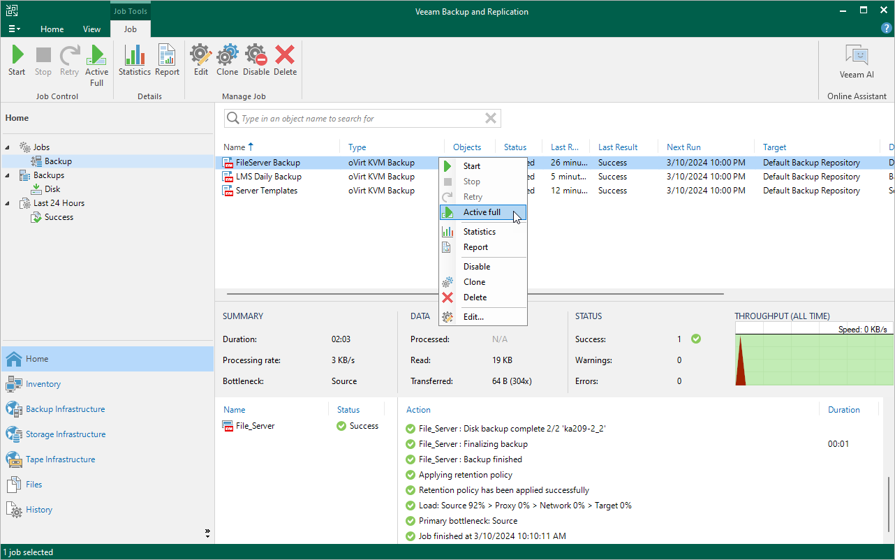 - In the working area, select the job and click Active Full on the ribbon.
