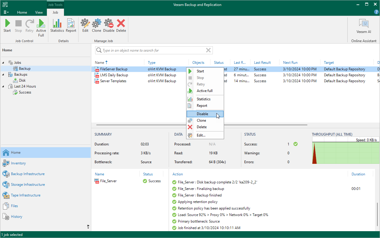By default, all created backup jobs run according to the specified schedules. However, you can temporarily disable a job so that it does not run automatically. You will still be able to enable the disabled job at any time you need.