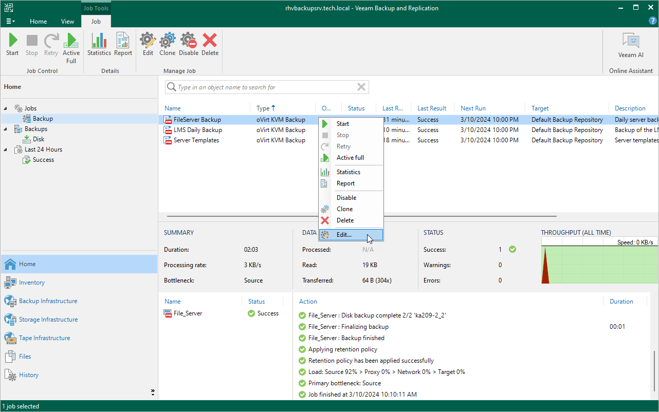 3. To change the backup repository where backups are stored, to configure backup job retention settings, to schedule active and synthetic full backups, and to configure health checks, follow the instructions provided in section Creating Backup Jobs (step 4).