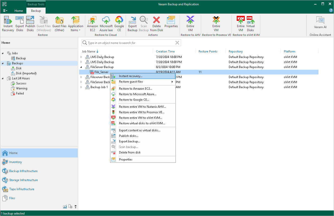 With Instant VM Recovery, you can immediately restore oVirt VMs as VMware vSphere, Microsoft Hyper-V or Nutanix AHV VMs to your production environment by running them directly from their backups. Instant VM Recovery helps you improve recovery time objectives and minimize disruption and downtime of production workloads. For more information on Instant VM Recovery, see the Veeam Backup & Replication User Guide, section VM Recovery.