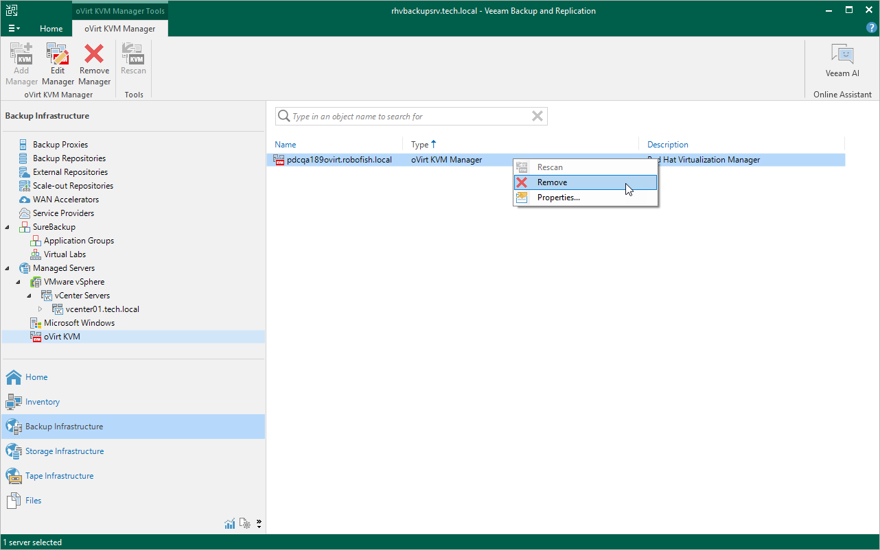 3. In the working area, select the oVirt KVM Manager and click Remove Manager on the ribbon.