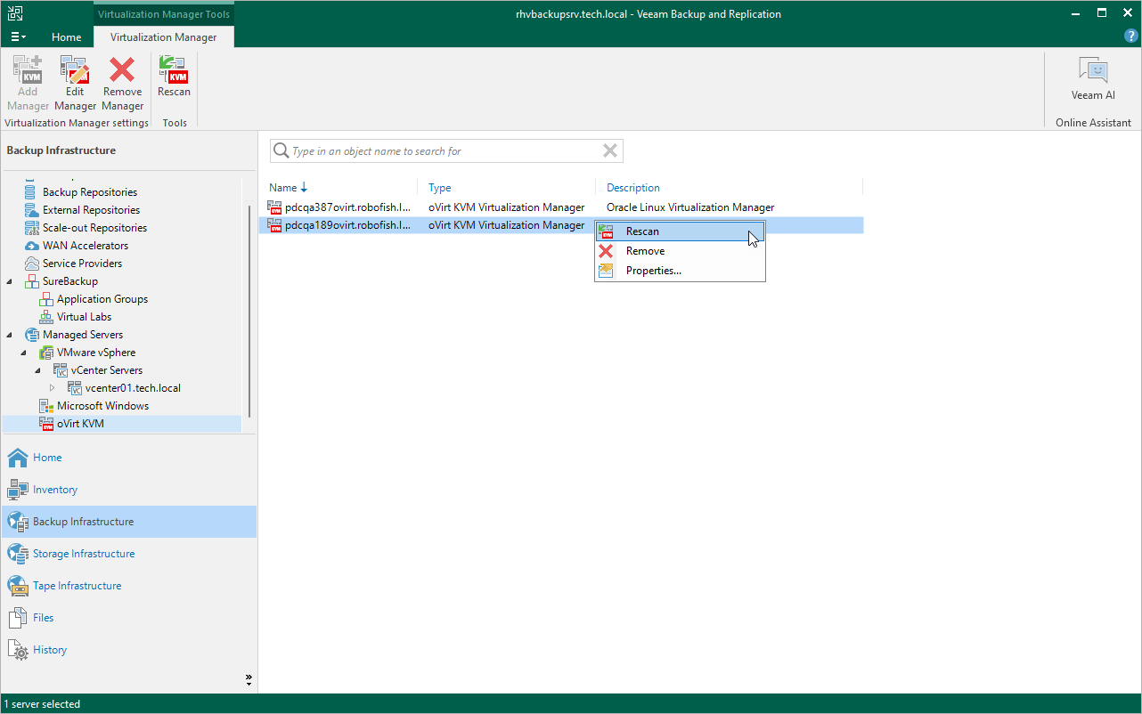 Veeam Backup for OLVM and RHV retrieves information about the oVirt KVM environment from the oVirt KVM Manager. However, the data synchronization process may take some time to complete. If you make any changes to the oVirt KVM environment and want the Veeam Backup & Replication console to display the changes immediately, you can rescan the oVirt KVM Manager manually.