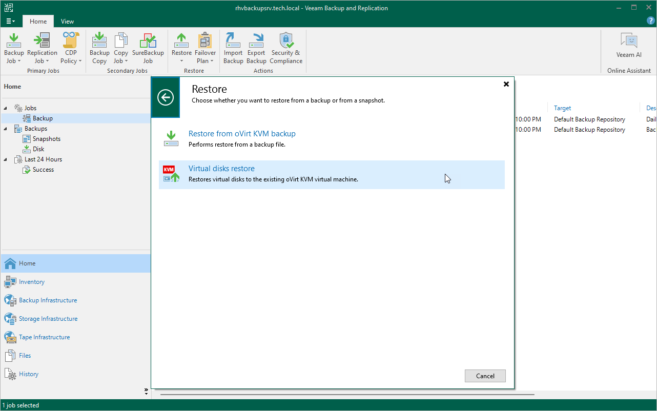 Alternatively, you can expand the necessary backup in the working area, right-click the VM and select Restore virtual disks to oVirt KVM.