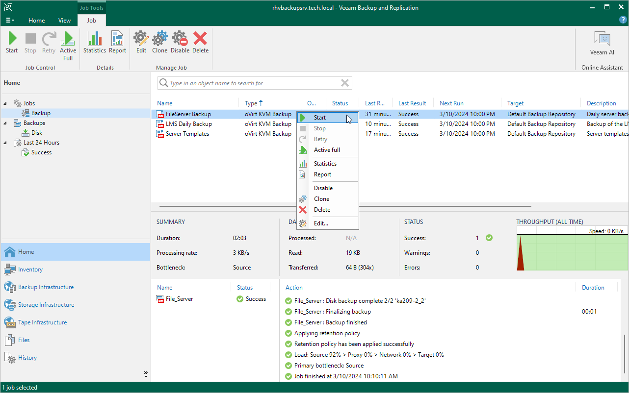 You can start a backup job manually, for example, if you want to create an additional restore point and do not want to modify the configured job schedule. You can also stop a backup job manually if processing of an oVirt VM is about to take too long, and you do not want the job to have an impact on the production environment during business hours. When you stop a running job, Veeam Backup for OLVM and RHV creates a new restore point only for those VMs that have already been processed by the time you stop the job.
