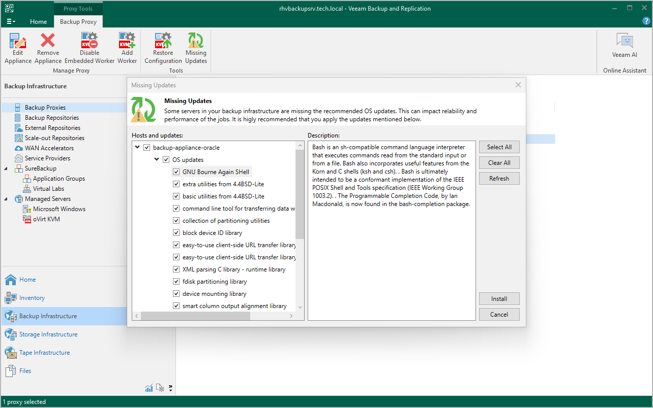 3. In the working area, select the backup appliance and click Missing Updates on the ribbon.