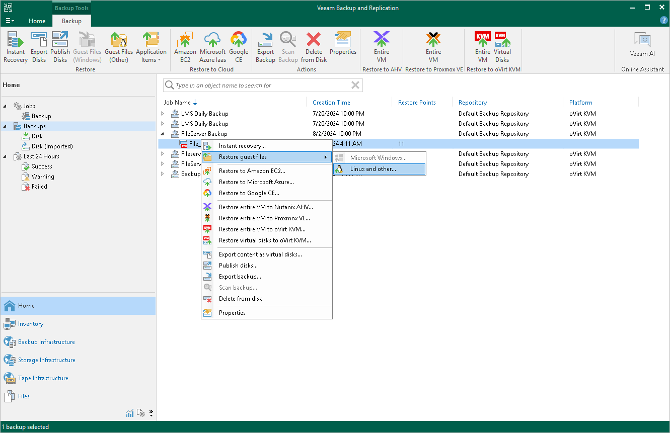 With guest OS file recovery (file-level restore), you can restore individual guest OS files and folders from oVirt VM backups created with Veeam Backup for OLVM and RHV. When restoring files and folders, you do not need to extract the VM image to a staging location or start the VM prior to restore. For more information on VM guest OS file restore, see the Veeam Backup & Replication User Guide, section Guest OS File Recovery.