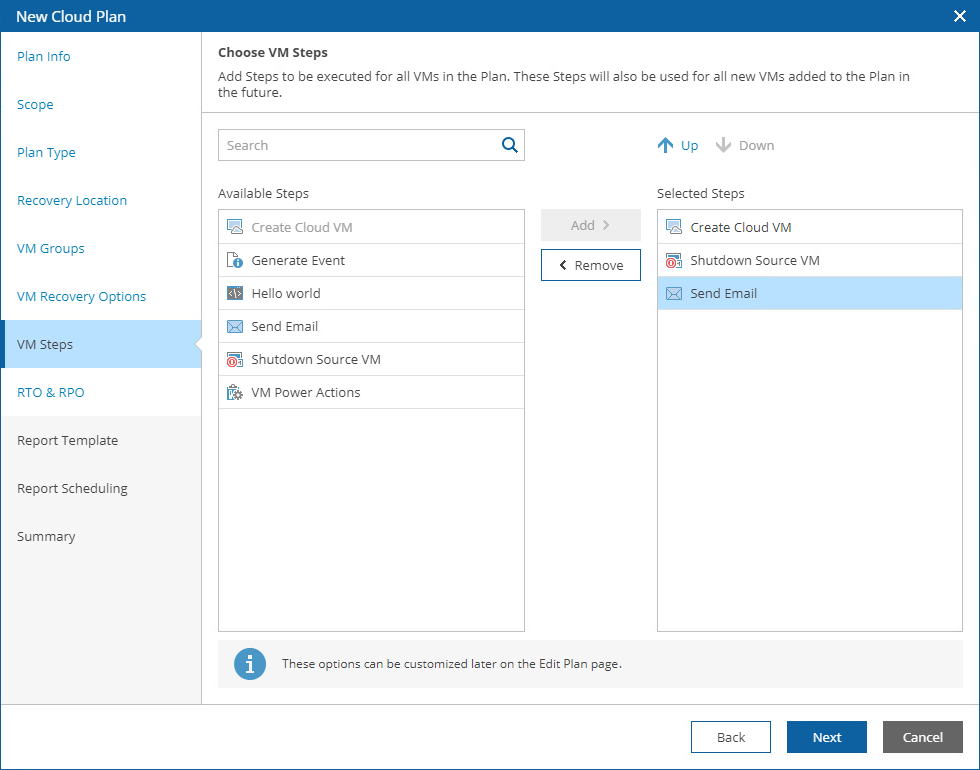 At the VM Steps step of the wizard, use the list of plan steps to select steps to be performed for each machine during cloud restore.