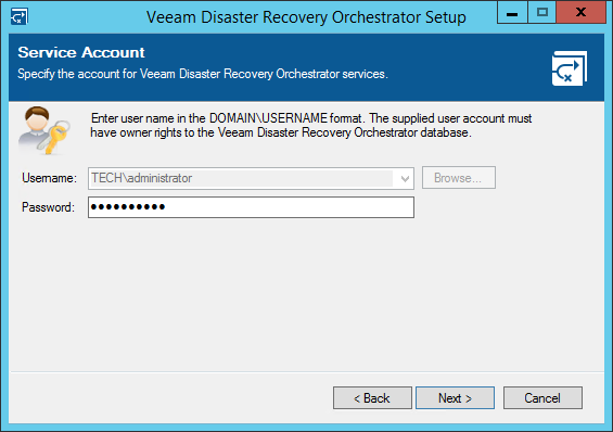 The installer will automatically detect the account that was previously used to run the Veeam Orchestrator Server Service. At the Service Account step of the wizard, enter the password for the account.