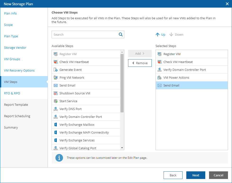 At the VM Steps step of the wizard, use the list of plan steps to select steps to be performed for each VM during storage failover.