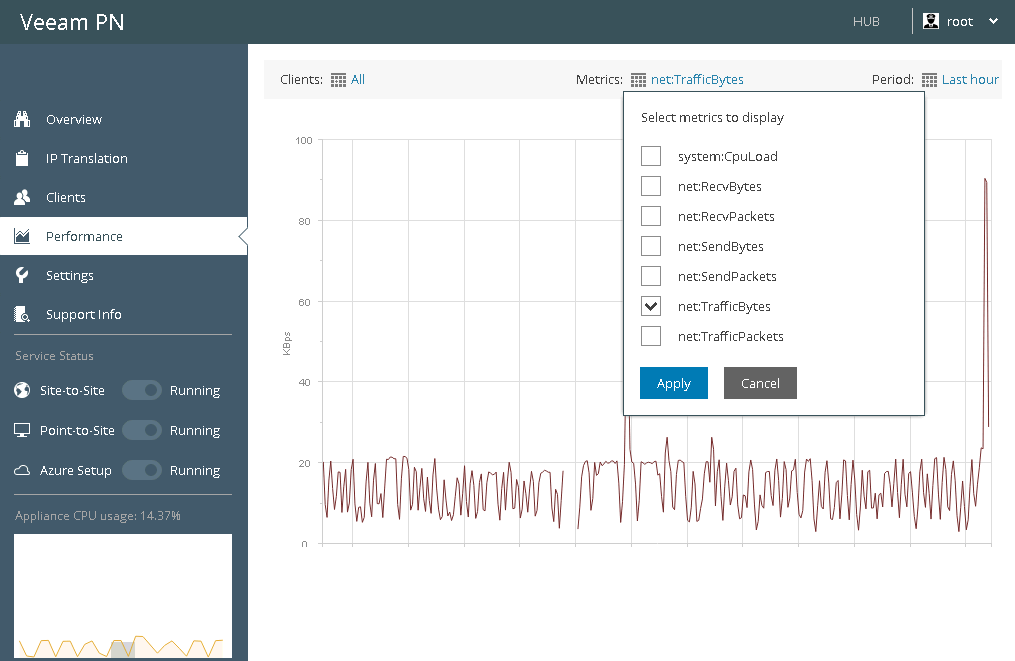 - At the top of the chart, click the link next to the Metrics field and select one or more network metrics that you want to display in the chart. Veeam PN tracks the following metrics: