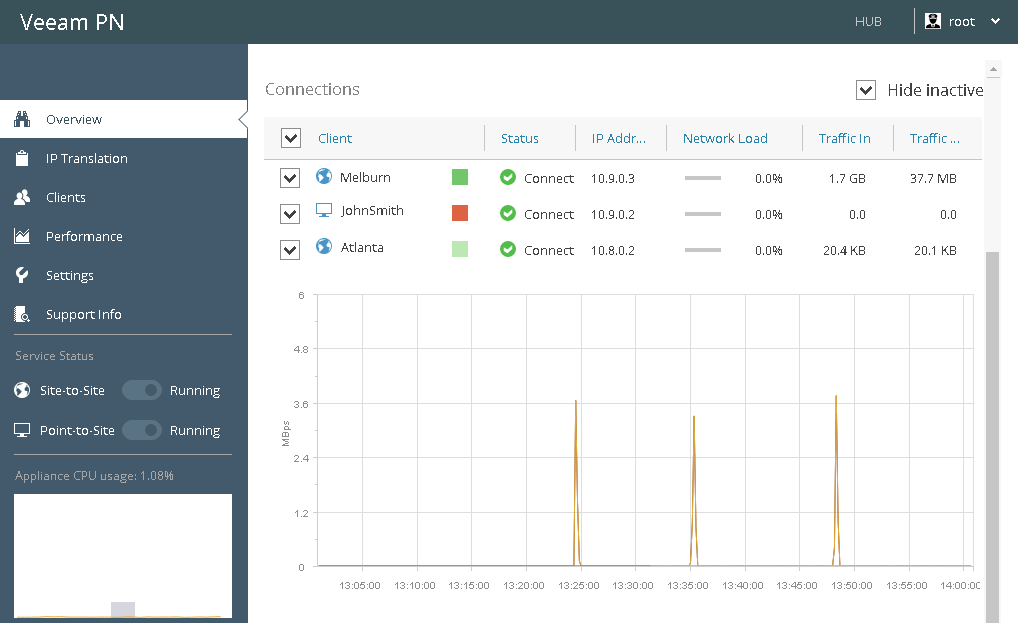 You can monitor the state of clients connected to the VPN, get information about the amount of sent and received traffic and so on. Veeam PN provides the following monitoring views: