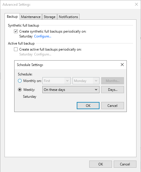 - To schedule synthetic full backups, on the Backup tab, select the Create synthetic full backups periodically check box, click Configure and choose whether you want to create synthetic full backups on specific days every week or on specific days of specific months.