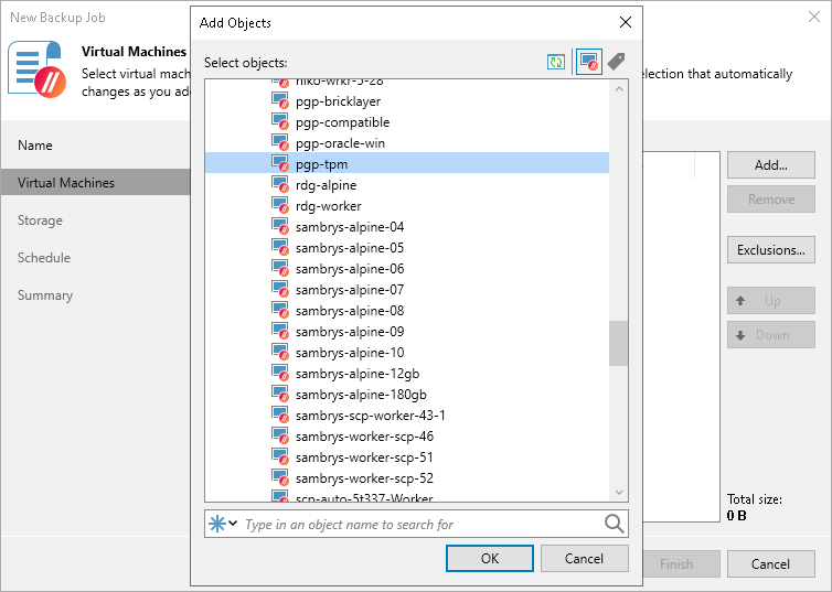 - In the Add Objects window, choose whether you want to back up all VMs in the cluster, only specific VMs or groups of VMs included into VM tags:
