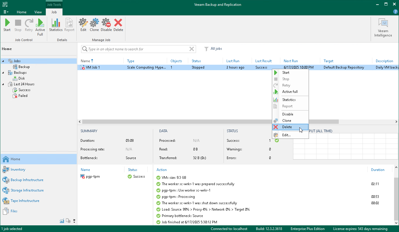You can permanently delete a backup job from the Veeam Plug-in for Scale Computing HyperCore configuration database if you no longer need it. When you delete a job, backups created by this job are displayed under the Backups > Disk (Orphaned) node in the Home view of the Veeam Backup & Replication console. If you want to delete backup files as well, follow the instructions provided in section Deleting Backups.