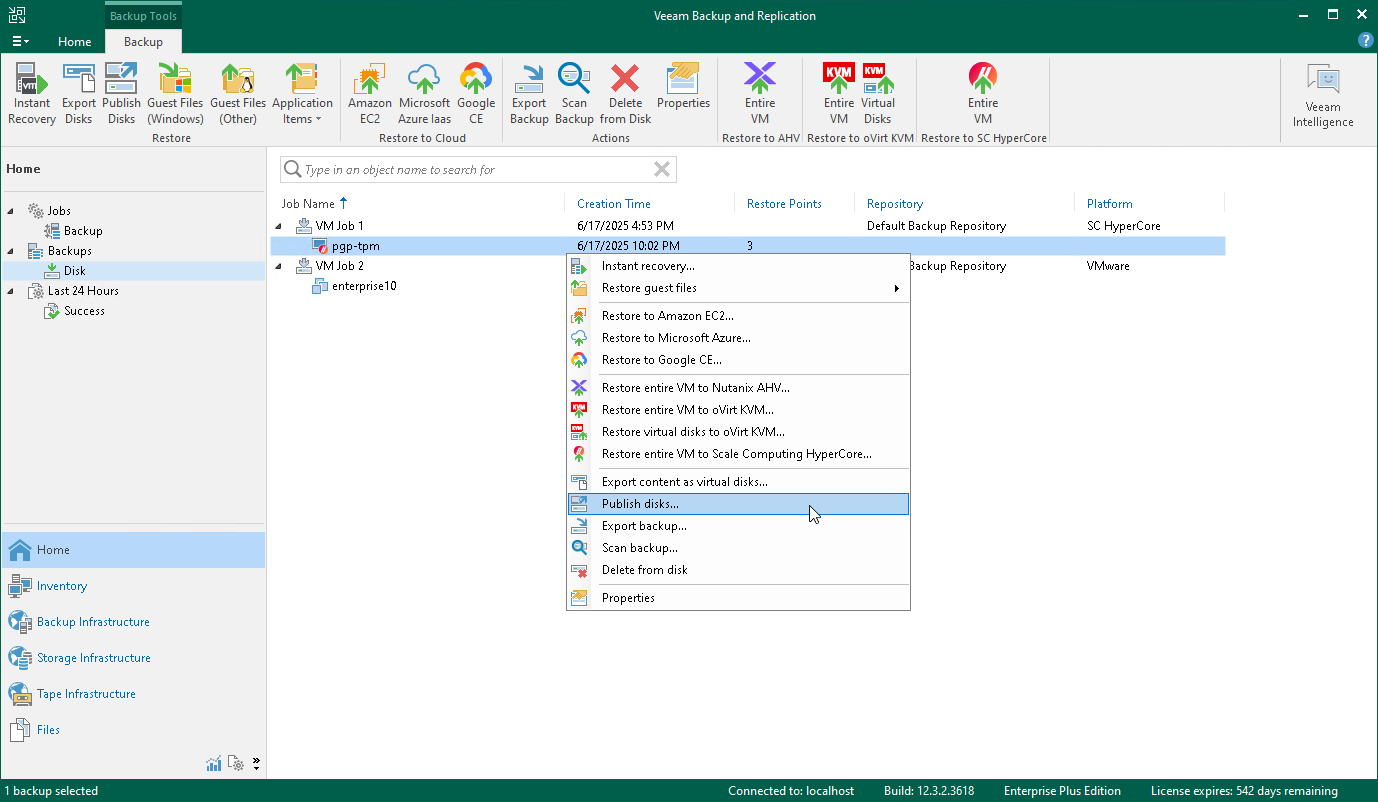 - In the working area, expand the necessary backup job, right-click the VM that contains disks you want to mount and select Publish disks.