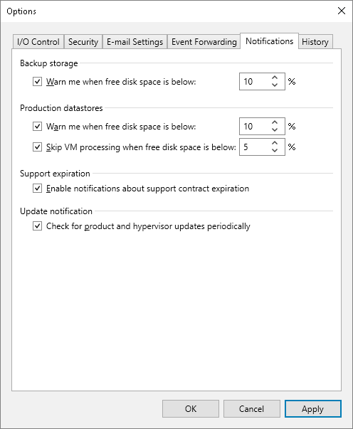 - In the Production datastores section, choose whether you want to receive notifications when Scale Computing HyperCore storage disks used as target locations for VM snapshots start running out of free space. While processing VMs included into backup jobs, Veeam Plug-in for Scale Computing HyperCore analyzes the amount of space left on target storage disks and displays warnings in job session details if a specific threshold is breached.