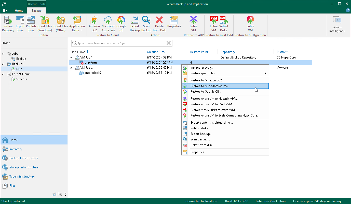 - In the working area, expand the necessary backup job, right-click the VM that you want to restore and select Restore to Microsoft Azure.