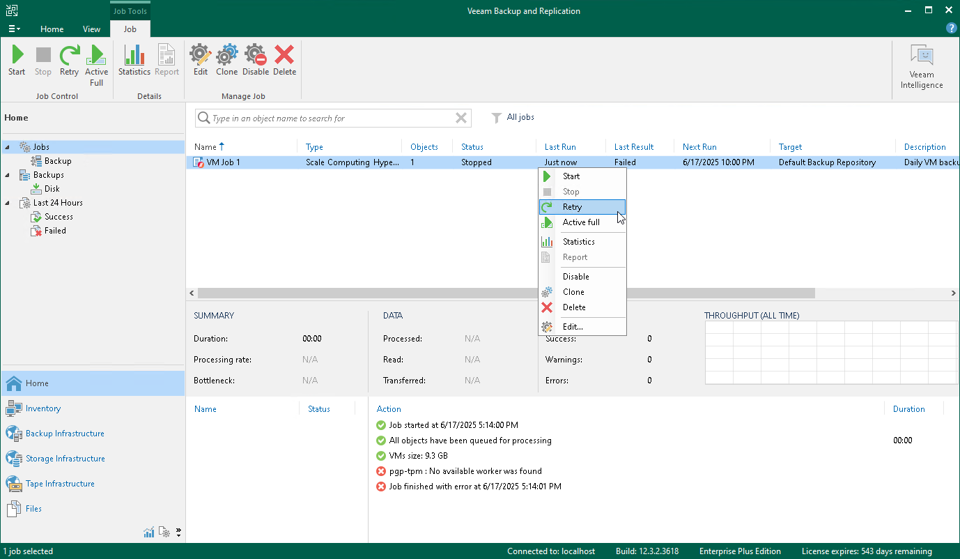 If a job fails, you can retry the backup operation. When you perform a retry, Veeam Plug-in for Scale Computing HyperCore restarts the operation only for the failed resources added to the job and does not process VMs that have been processed successfully. As a result, in cases when only a part of source objects remain unprotected, retrying a job takes less time compared to restarting the job for all resources.