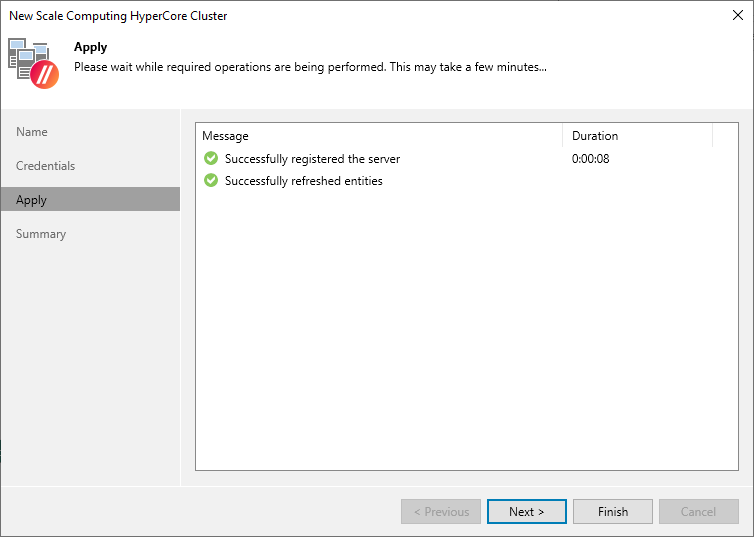 This is an archive version of the document. To get the most up-to-date information, see the current version. Step 4. Apply Settings At the Apply step of the wizard, wait until the Scale Computing HyperCore cluster is added to the backup infrastructure and then click Next.