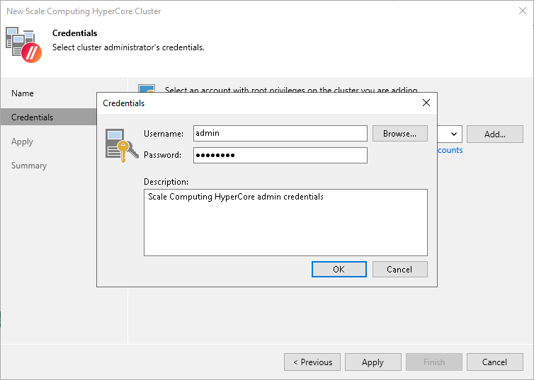 At the Credentials step of the wizard, specify credentials of an account that will be used to access the Scale Computing HyperCore cluster.
