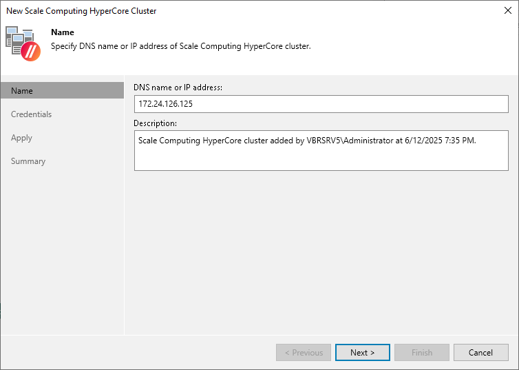 - In the DNS name or IP address field, enter the FQDN or IP address of the Scale Computing HyperCore standalone host or cluster node.