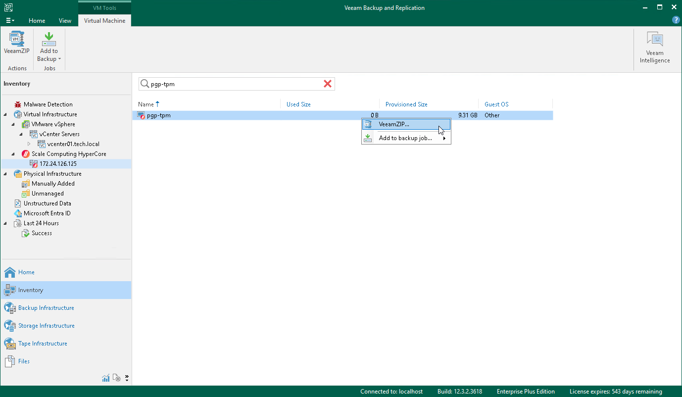 - In the working area, select the VM that you want to back up and click VeeamZIP on the ribbon.