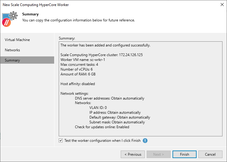 This is an archive version of the document. To get the most up-to-date information, see the current version. Step 4. Finish Working with Wizard At the Summary step of the wizard, review summary information and click Finish.TipTo test the worker, select the Test the worker configuration when I click Finish check box and then click Finish.
