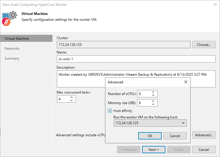 The default number of concurrent tasks is set to 4. When you change this value, the wizard automatically adjusts the amount of resources that will be allocated to the worker. If you want to specify the amount of resources manually as well as configure host affinity, click Advanced.