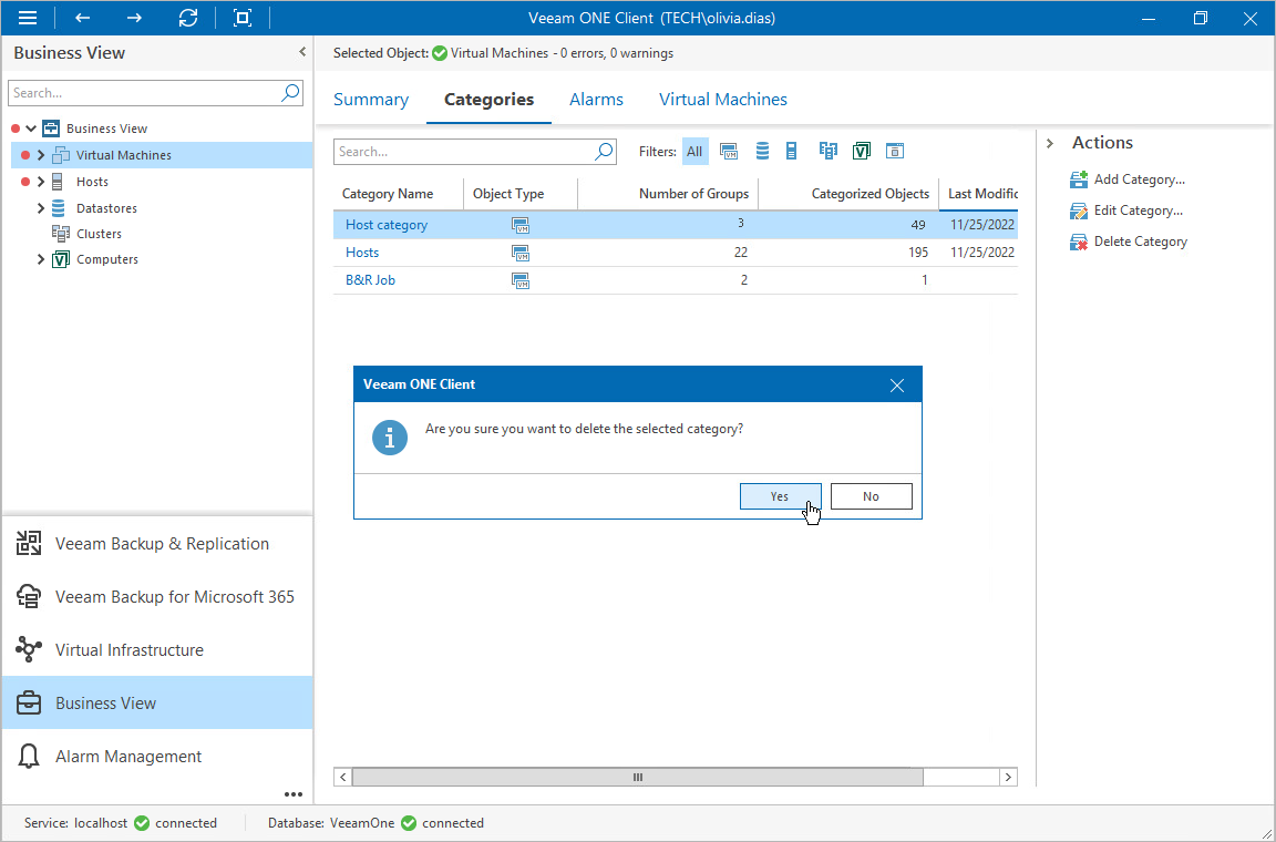 You can delete categories created in Veeam ONE Client as well as predefined categories and categories imported manually from a .CSV file. When you delete a category, objects from this category remain in your infrastructure.