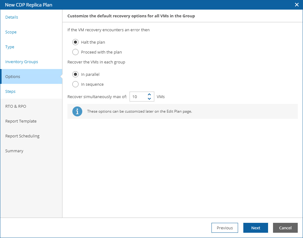At the Options step of the wizard, use the If the VM recovery encounters an error then options to choose whether you want to plan execution if VM recovery fails. This option can also be customized later per-group when editing the plan.