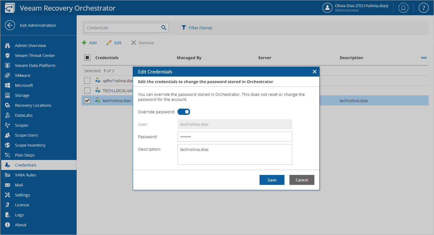You can also change a password for an account in the Orchestrator UI. However, keep in mind that if you change a password in the Orchestrator UI, the new password will not be synchronized into the Veeam Backup & Replication console.