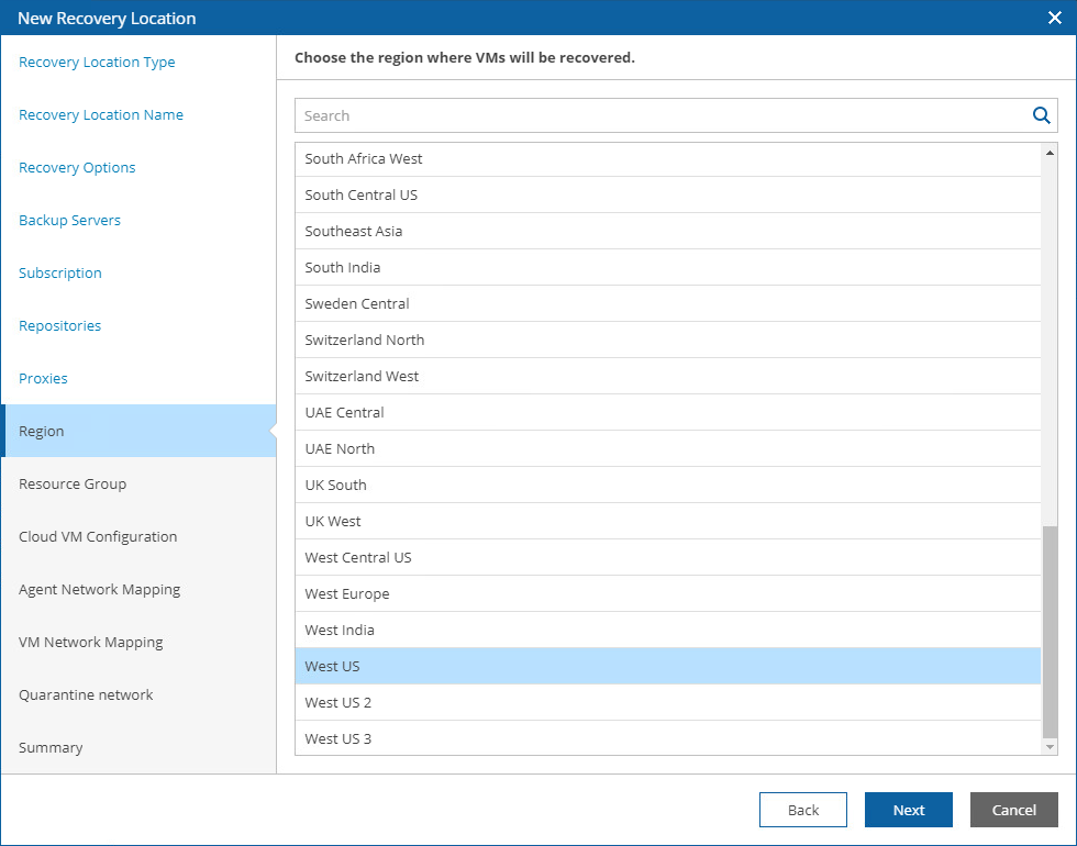 At the Regions step of the wizard, select a Microsoft Azure region in which the recovered VMs will reside.
