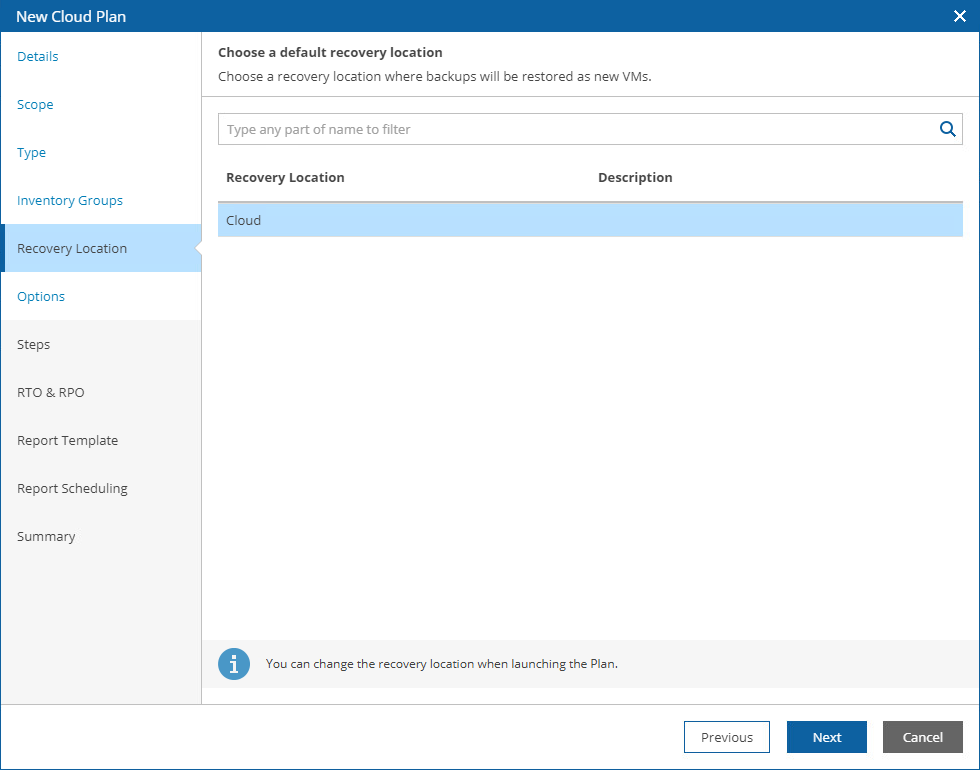 At the Recovery Location step of the wizard, select a location to which inventory groups included in the plan will be restored.