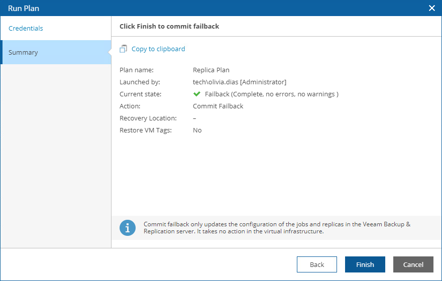 After the commit failback process completes, Orchestrator will leave the plan in the IN-USE mode. By design, this makes the results of the commit failback process accessible in the Orchestrator UI as long as required, and also prevents the plan from being modified by any automatic updates related to infrastructure changes. If you want to perform any further actions with the plan (for example, to test the plan, to run readiness checks or to execute the plan again), reset the plan as described in section Resetting Replica Plans. |