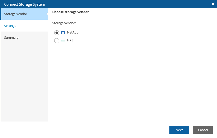 - At the Storage Vendor step of the wizard, choose whether you want to connect a NetApp or an HPE storage system.