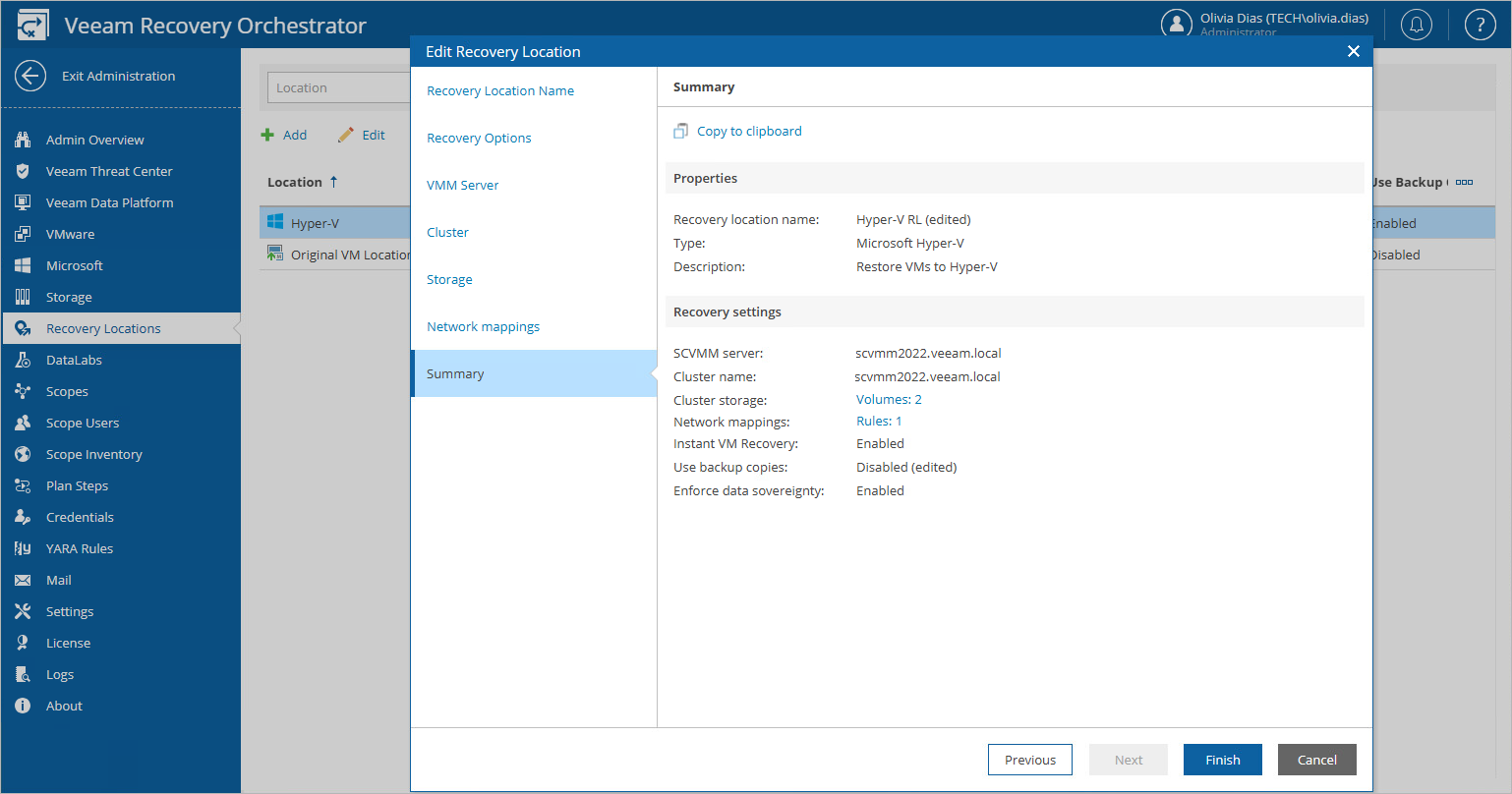 - To change the specified recovery options, follow the instructions provided in section Adding Microsoft Hyper-V Recovery Locations (step 4).