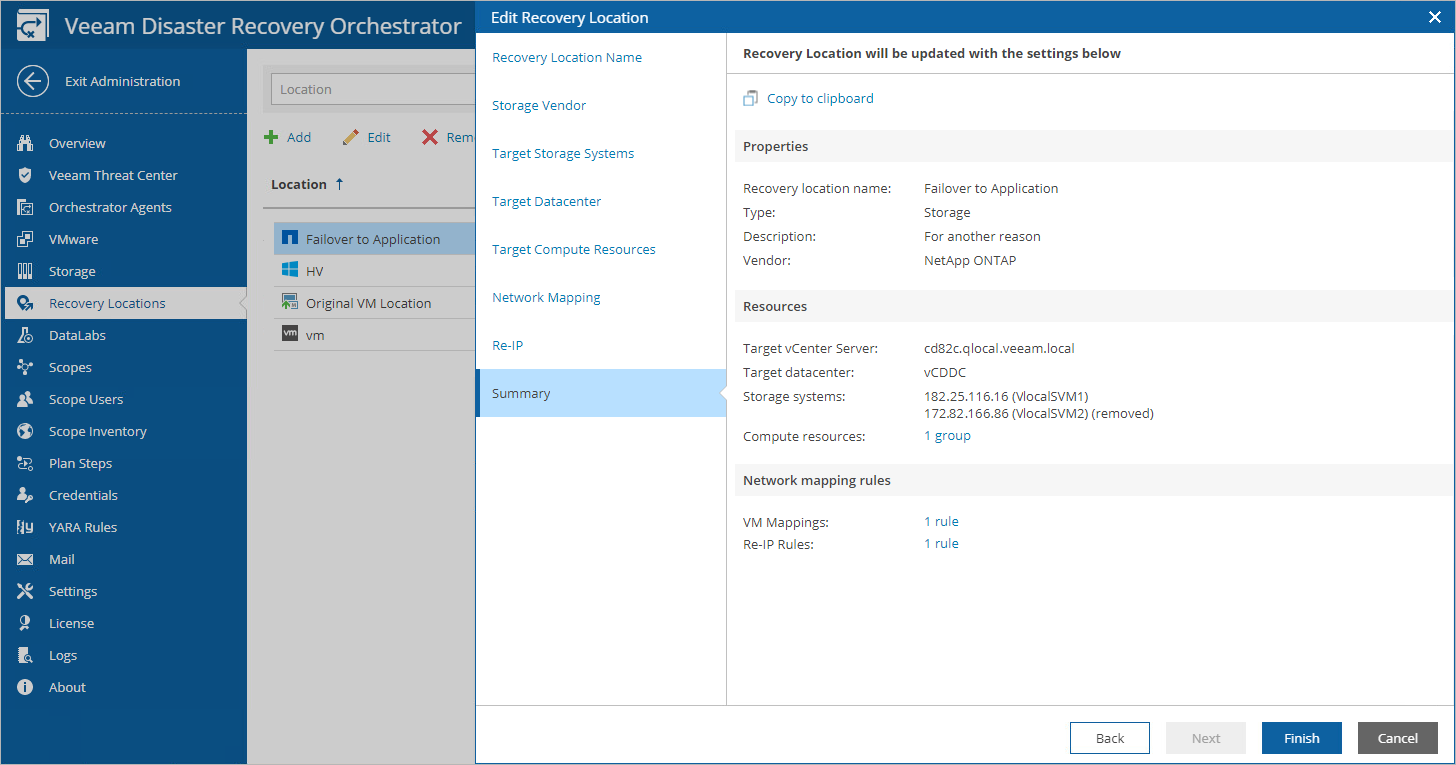 - To change the target storage systems used to recover VMs, follow the instructions provided in section Adding Storage Recovery Locations (step 4).