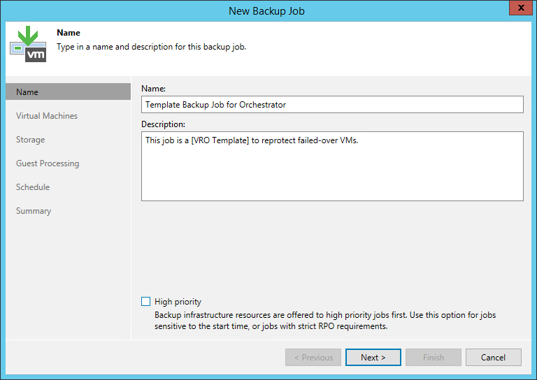 To accomplish this, configure a template job on the Veeam Backup & Replication server that protects the required machines and is connected to your Orchestrator server. For Orchestrator to discover the job as a template, you must create a standard backup or replication job and include the text [VRO Template] in the job description.