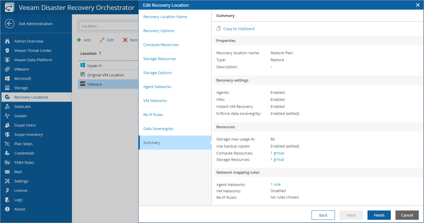 - To change the datastore capacity level that must not be breached during the recovery process or to choose whether you want Orchestrator to use backup files created by backup copy jobs, follow the instructions provided in section Adding VMware vSphere Recovery Locations (step 6).