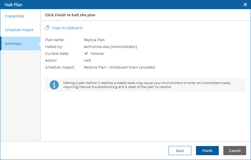 The Halt action interrupts plan execution. Any steps currently executing will be completed, then the plan will enter the HALTED state. To learn how to work with HALTED CDP replica plans, see Managing Halted Plans.
