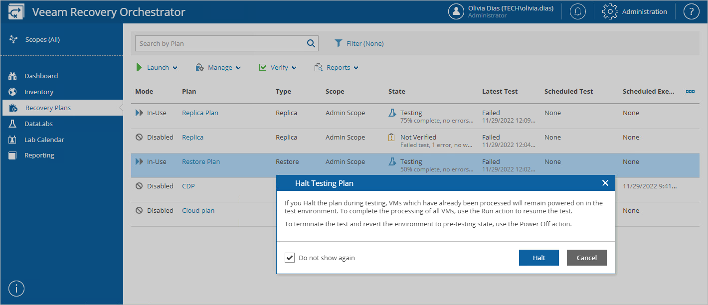 The Halt action interrupts plan testing. You may need to halt plan testing, for example, if you need to fix some environment-related issues and then proceed with testing later (in this case, recovered VMs will still continue to run). Or you may need to stop the testing process completely, for example, if you no longer need to test the selected restore plan (in this case, recovered VMs will be deleted).