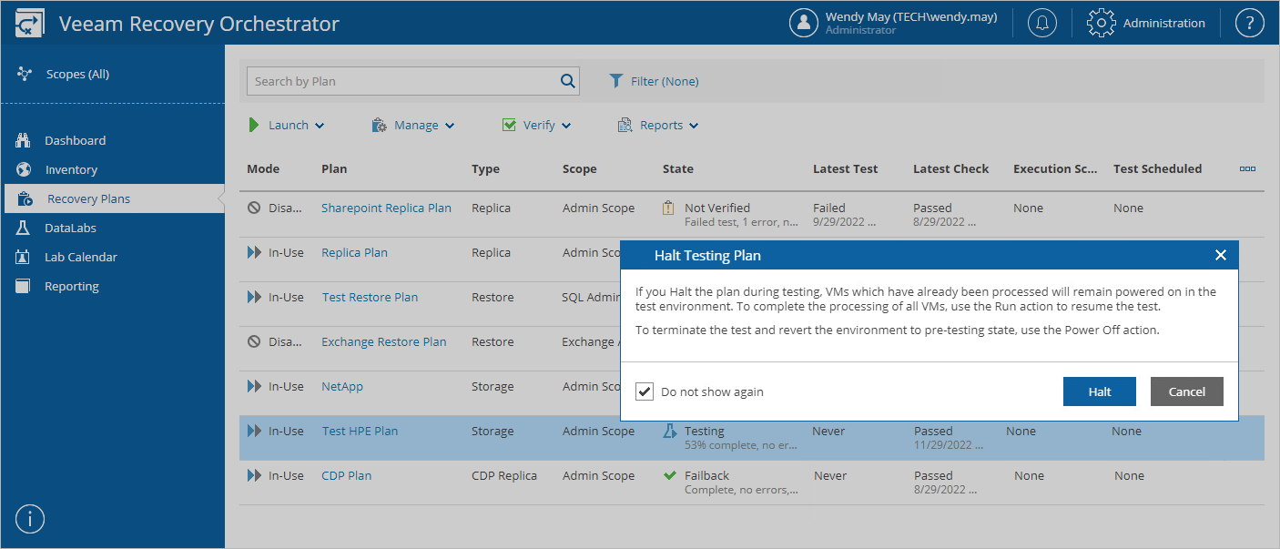 The Halt action interrupts plan testing. You may need to halt plan testing, for example, if you need to fix some environment-related issues and then proceed with testing later (in this case, recovered VMs will still continue to run). Or you may need to stop the testing process completely, for example, if you no longer need to test the selected storage plan (in this case, recovered VMs will be deleted).