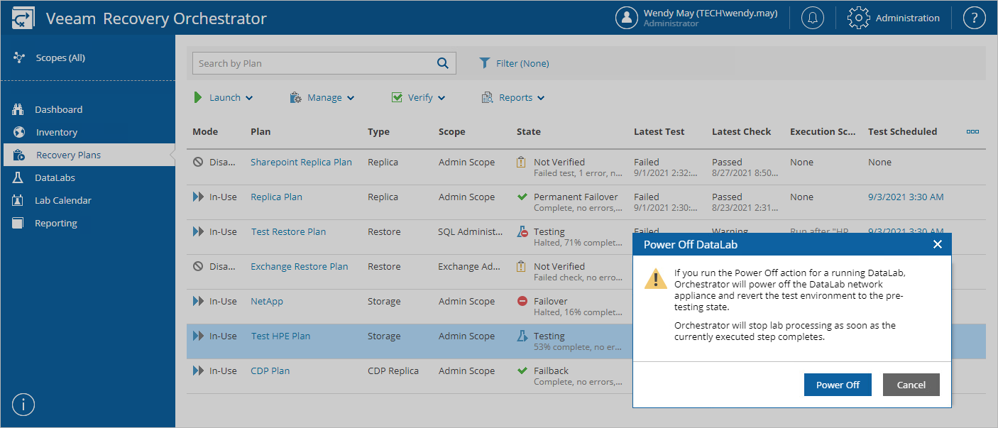 Right-click the plan name and select Verify > Power Off DataLab Test.