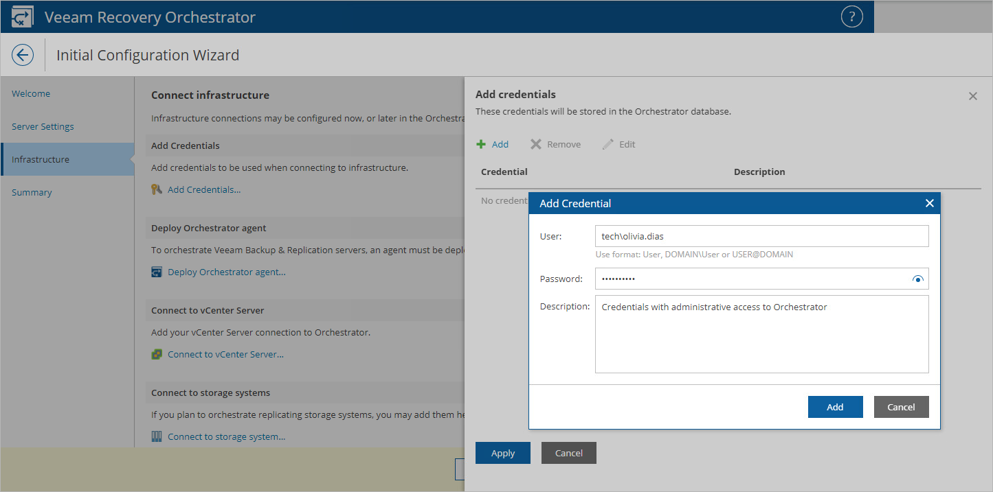 In the Add Сredentials section of the Infrastructure step of the wizard, specify credentials of user accounts for connecting to infrastructure: