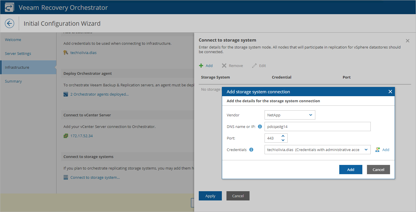 - Repeat the procedure for each storage system that you want to connect to Orchestrator, and click Apply.