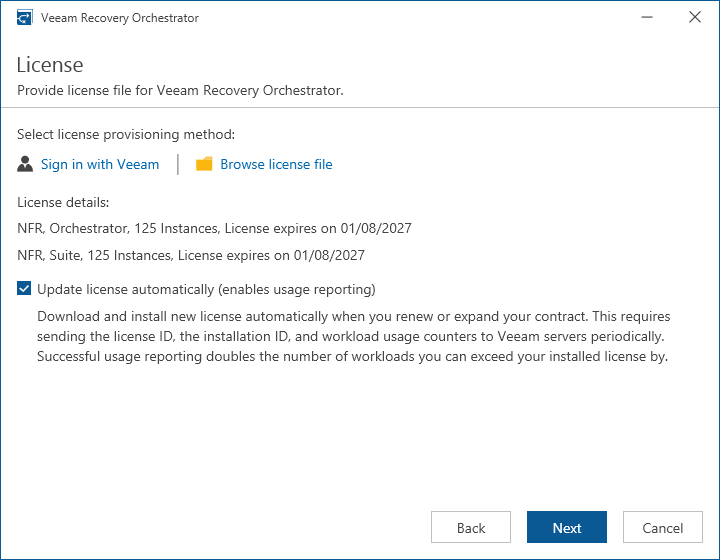 You can instruct Orchestrator to update the license automatically. If automatic license update is enabled, Orchestrator proactively communicates with the Veeam License Update Server to obtain and install a new license before the current license expires. You can enable automatic license update later when configuring Orchestrator.