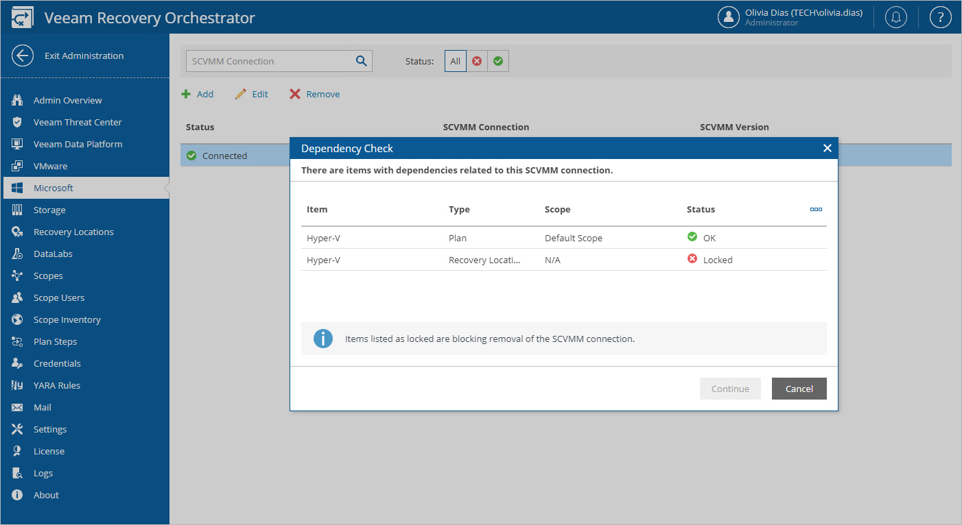 In this case, wait until Orchestrator stops processing the items, remove this SCVMM server or cluster from the locked recovery locations, reset the locked recovery plans — and then try removing the connection again.